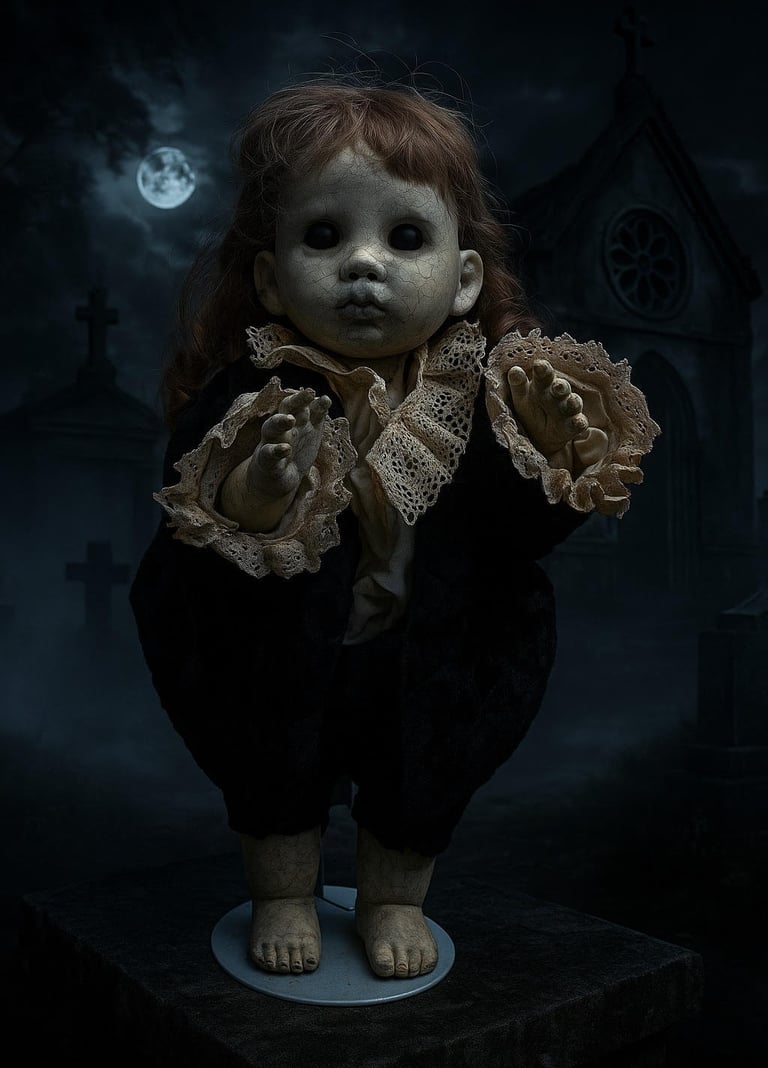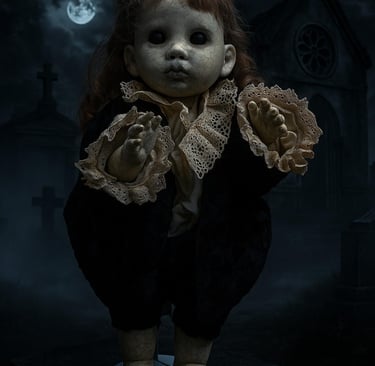 One early spring evening, after another day of merciless taunts, Étienne fled to the cemetery once more. But this time, he did not return. No trace of him was ever found - no body, no footprints, nothing but whispers. Days later, when the groundskeeper unlocked the wrought-iron gate, there upon a tomb was Aimée. Yet she was changed. The doll now wore Étienne’s velvet and lace suit, the very garments he had been seen in when last alive. Her smile seemed sadder somehow, her dark eyes clouded with sorrow, as if she had taken the boy’s gentle spirit within her...