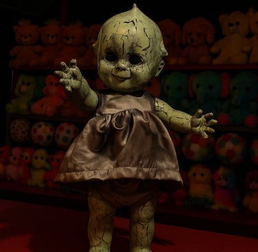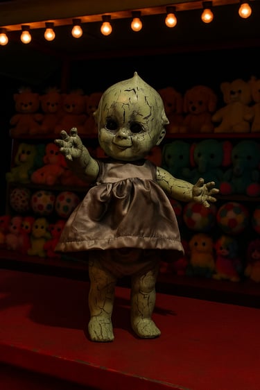 The dolls and artifacts in this series were recovered from a long-forgotten carnival train abandoned in rural Illinois. Inside the dusty prize box, they sat waiting as if the midway lights might flicker on again at any moment. Each one carries the faded charm of a carnival long gone-and just enough mystery to wonder why they were never claimed.